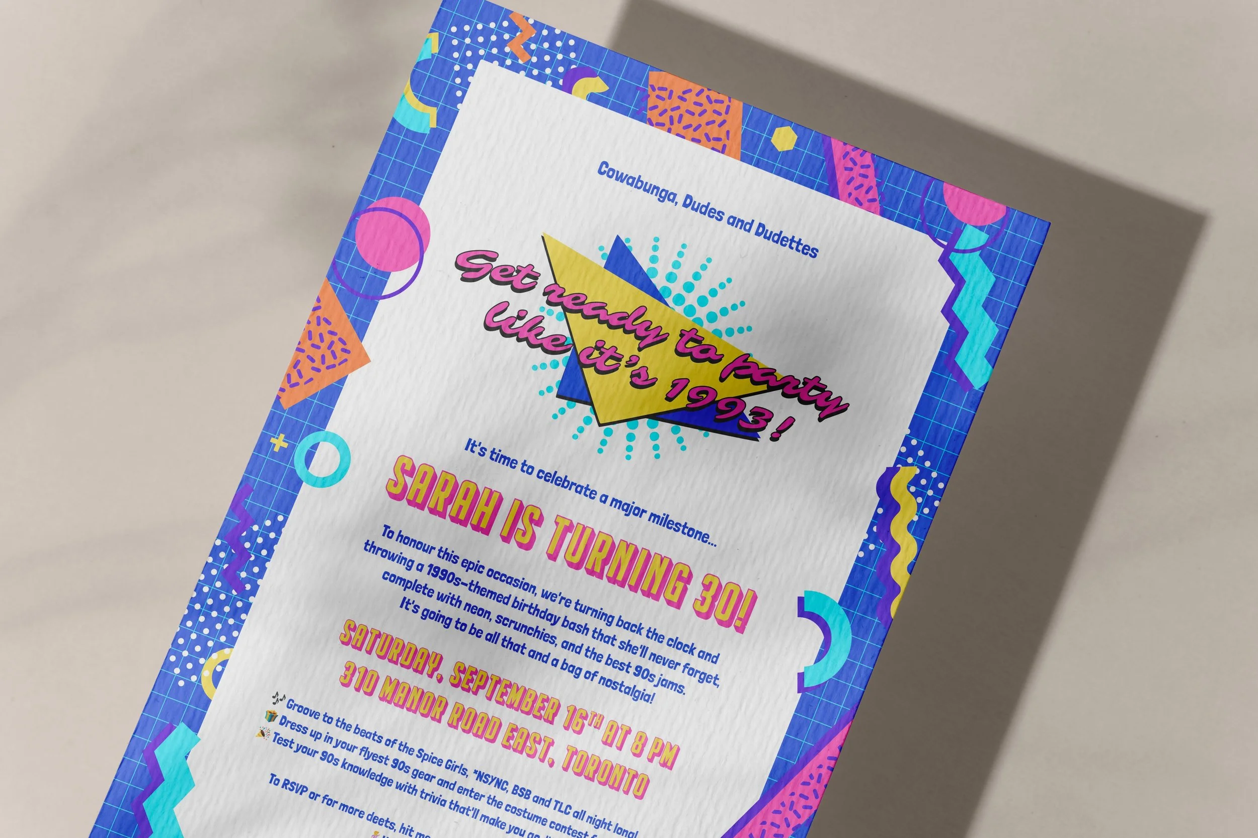Client requested a custom 90’s themed birthday party invitation, complete with bright colours and bold patterns — a requisitory detail to encapsulate the 90’s era and “saved by the bell” vibes.